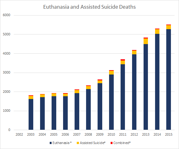 [t]here is significant evidence from the Benelux countries (Belgium, Netherlands, Luxembourg), as well as the US and Canada, to support this claim. Around 3.7% of all deaths in the Netherlands in 2015 were by virtue of euthanasia or assisted suicide, up from 1.3% when the procedure was legalised in 2002.